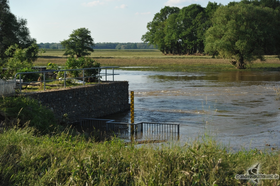 Schaden ist bei uns trotzdem entstanden. Das Wasser stand im Grundstück und im Haus ein wenig höher als zum Hochwasser 2002. Ungefähr einen Meter hoch liegt die Marke diesmal. Ich bin nicht mal zum genauen messen gekommen. Eine Kerbe an der Tür markiert den Stand. Dennoch sind wir sehr froh das das alte Lehmhaus das Wasser überstanden hat. Nicht auszudenken was passiert wäre wenn der Ringdeich nicht gehalten hätte.